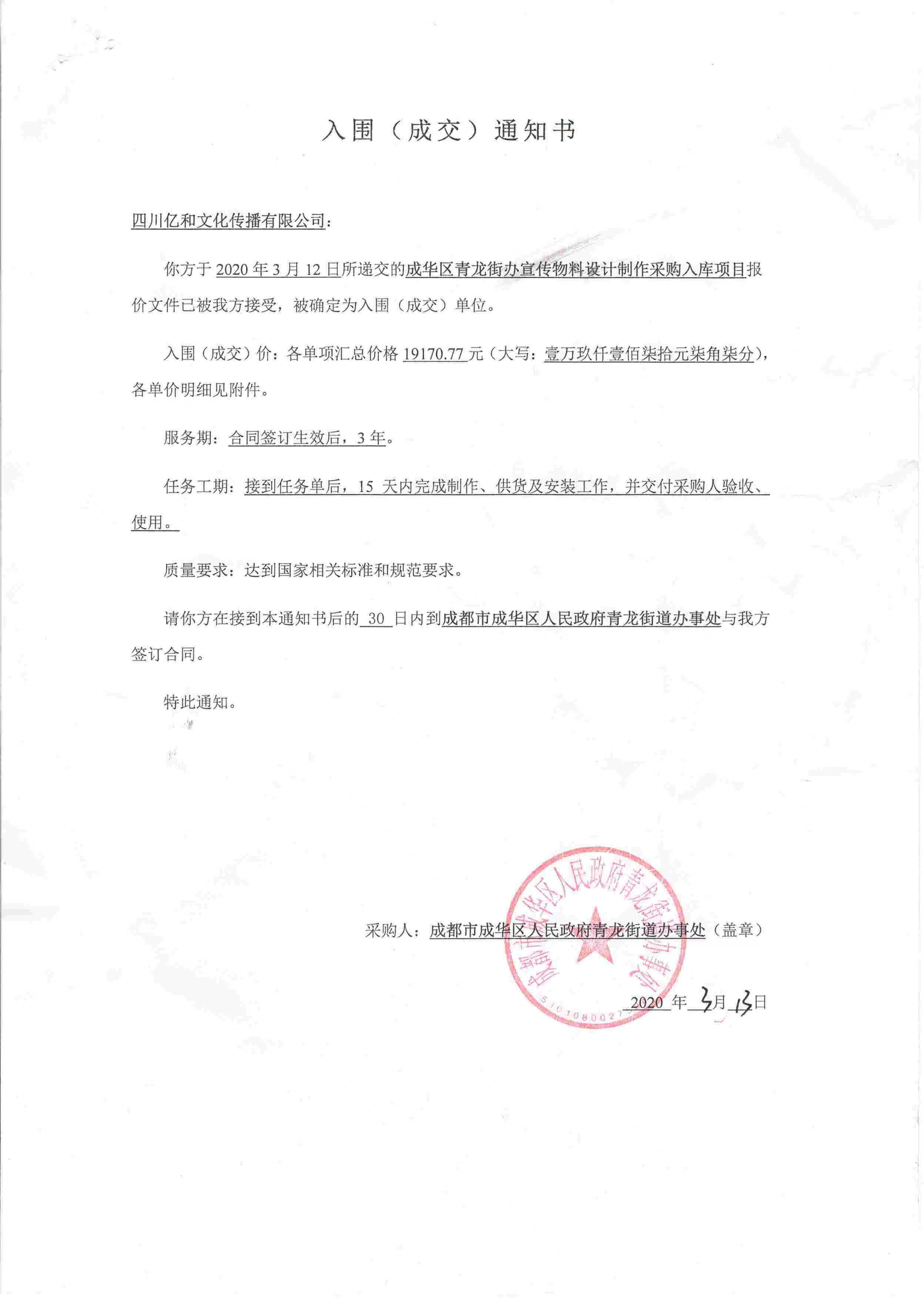 【喜訊】公(gōng)司中(zhōng)标2020年“成華區(qū)青龍街(jiē)道辦(bàn)宣傳物(wù)料設計制作(zuò)采購(gòu)入庫項目”!